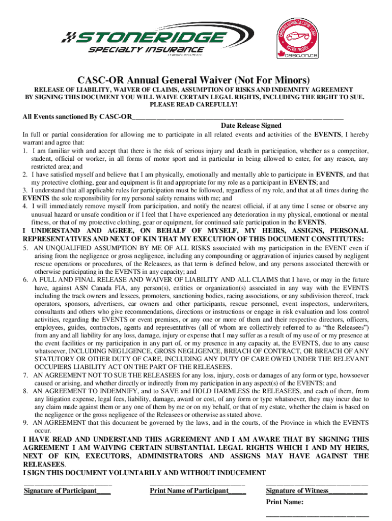 CASTOR Annual General Waiver (Not For Minors) RELEASE OF LIABILITY, WAIVER OF CLAIMS, ASSUMPTION OF RISKS AND INDEMNITY AGREEMENT BY SIGNING THIS DOCUMENT YOU WILL WAIVE CERTAIN LEGAL RIGHTS, INCLUDING