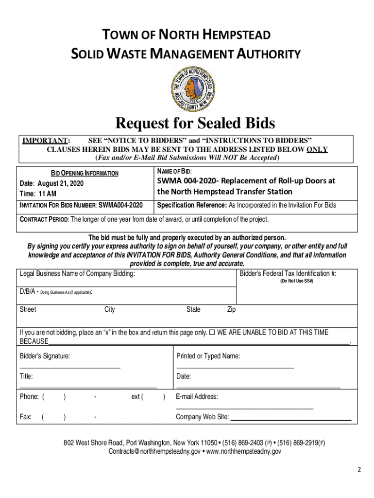 TOWN OF NORTH HEMPSTEAD SOLID WASTE MANAGEMENT AUTHORITYRequest for Sealed Bids IMPORTANT: SEE NOTICE TO BIDDERS and INSTRUCTIONS TO BIDDERS CLAUSES HEREIN BIDS MAY BE SENT TO THE ADDRESS LISTED BELOW