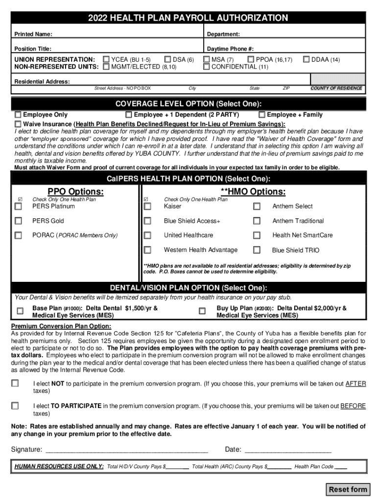 2022 HEALTH PLAN PAYROLL AUTHORIZATION Printed Name:Department:Position Title:Daytime Phone #:UNION REPRESENTATION: UNREPRESENTED UNITS:CEA (BU 15) DSA (6) MGMT×ELECTED (8,10×MSA (7) POA (16,17)