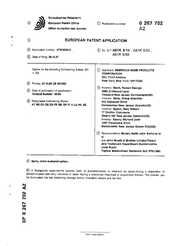 Get the free Spray dried acetaminophen - European Patent Office - EP 0267702 A2. A therapeutic ta...