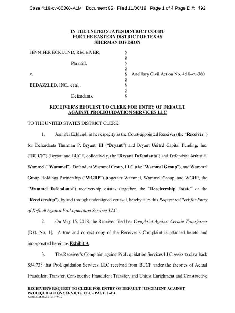 Case 4:18cv00360ALM Document 85 Filed 11×06/18-Page 1 of 4 Paged #: 492IN THE UNITED STATES DISTRICT COURT FOR THE EASTERN DISTRICT OF TEXAS SHERMAN DIVISION JENNIFER ENGLAND, RECEIVER, Plaintiff,