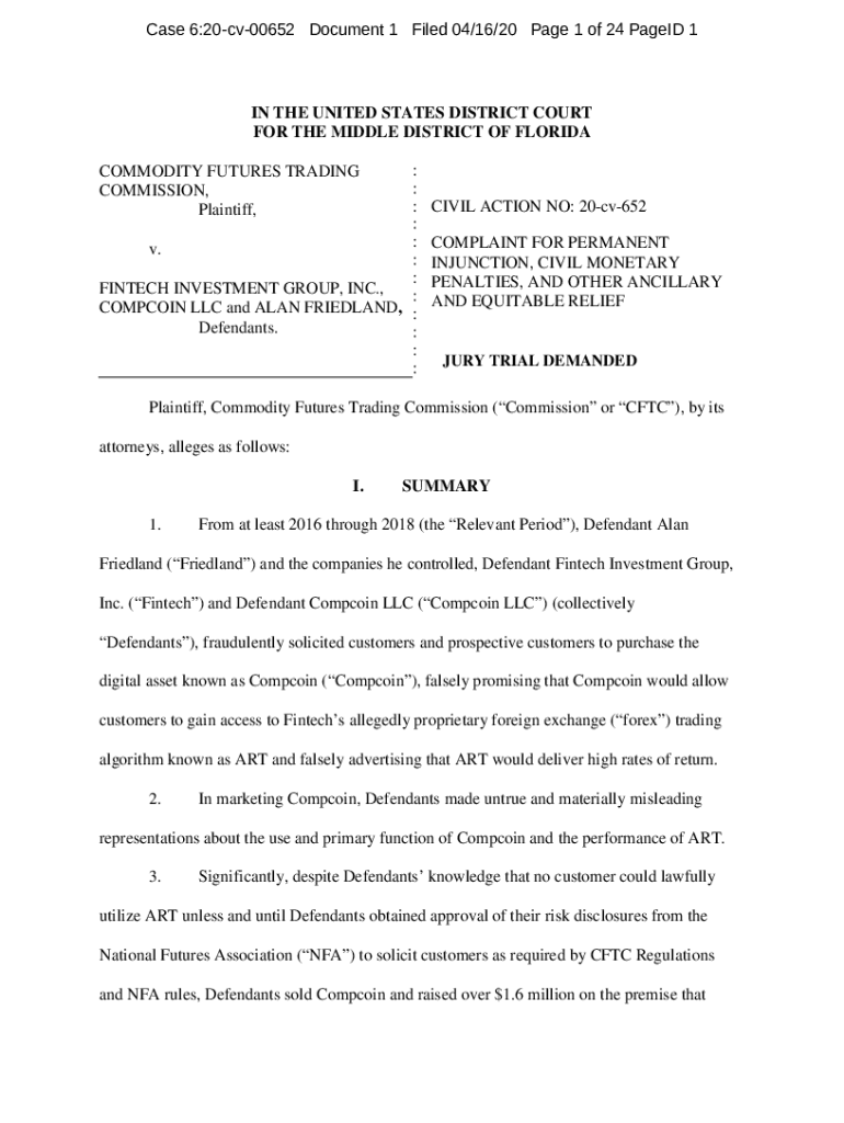 Case 6:20cv00652 Document 1 Filed 04×16/20-Page 1 of 24 Paged 1IN THE UNITED STATES DISTRICT COURT FOR THE MIDDLE DISTRICT OF FLORIDA : : : : : v. : : FINTECH INVESTMENT GROUP, INC., : COMP COIN