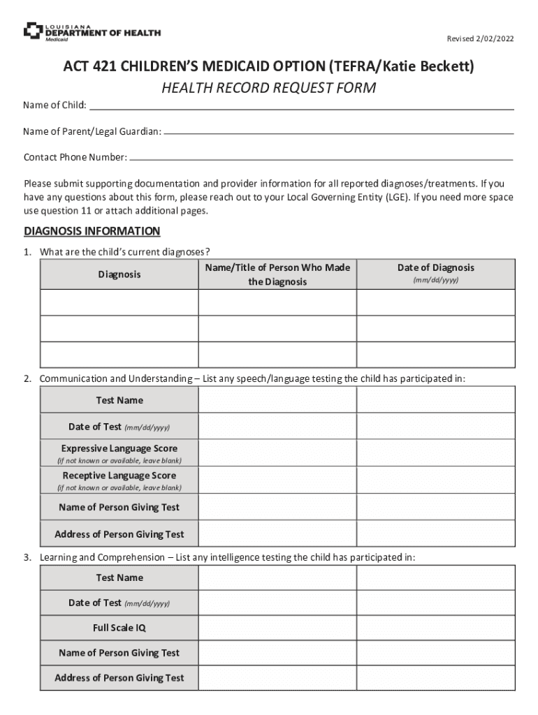Revised 2×02/2022ACT 421 CHILDREN MEDICAID OPTION (TERRA×Katie Beckett) HEALTH RECORD REQUEST FORM Name of Child: Name of Parent×Legal Guardian: Contact Phone Number: Please submit supporting documentation