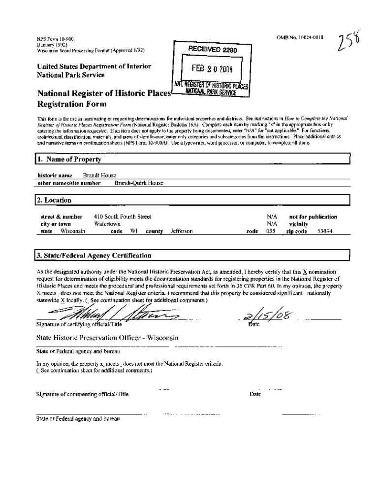 OMB No. 100240018NFS Form 10900 (January 1992) Wisconsin Word Processing Format (Approved 1×92)RECEIVED 2280United States Department of Interior National Park ServiceNational Register of Historic