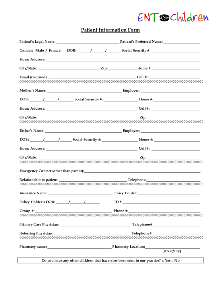 Patient Information Form Patients Legal Name:Patients Preferred Name:Gender: Male / Female DOB://Social Security #. . Home Address:. City/State:Zip:Home #:. Email (required): Cell #:. Mothers