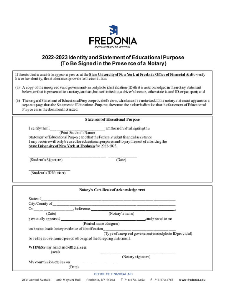 20222023 Identity and Statement of Educational Purpose (To Be Signed in the Presence of a Notary) If the student is unable to appear in person at the State University of New York at Macedonia Office