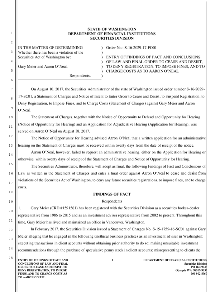 STATE OF WASHINGTON DEPARTMENT OF FINANCIAL INSTITUTIONS SECURITIES DIVISION1 2 3 4 5IN THE MATTER OF DETERMINING Whether there has been a violation of the Securities Act of Washington by: Gary Meier