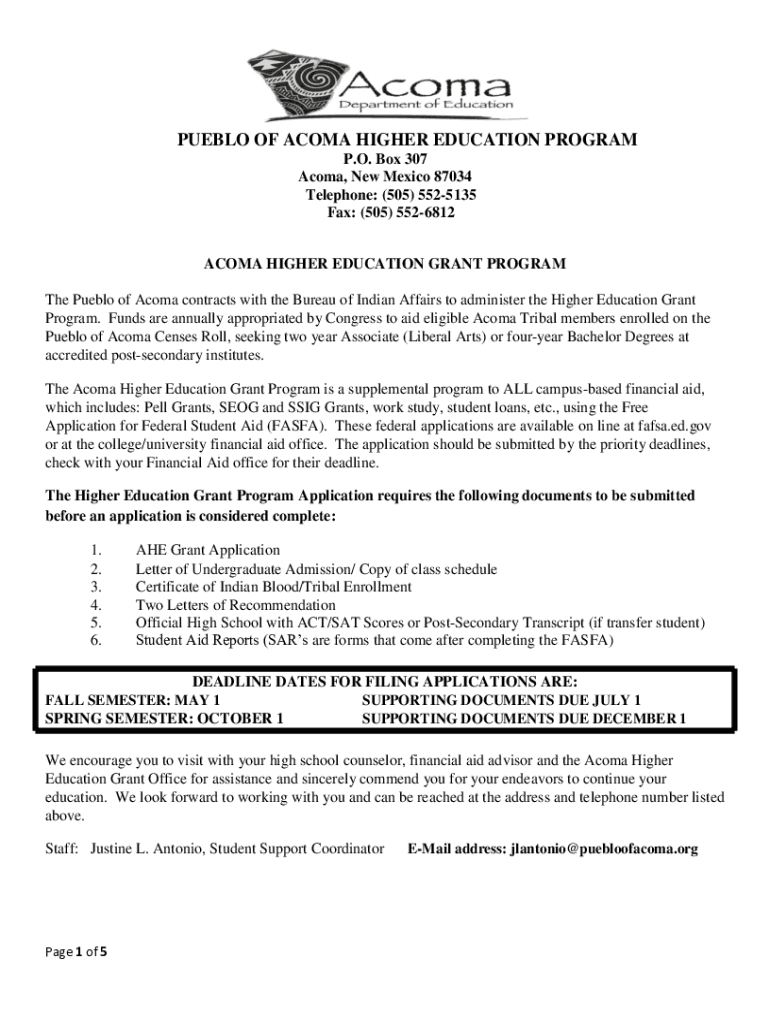 PUEBLO OF COMA HIGHER EDUCATION PROGRAM P.O. Box 307 Coma, New Mexico 87034 Telephone: (505× 5525135 Fax: (505× 5526812 COMA HIGHER EDUCATION GRANT PROGRAM The Pueblo of Coma contracts with the