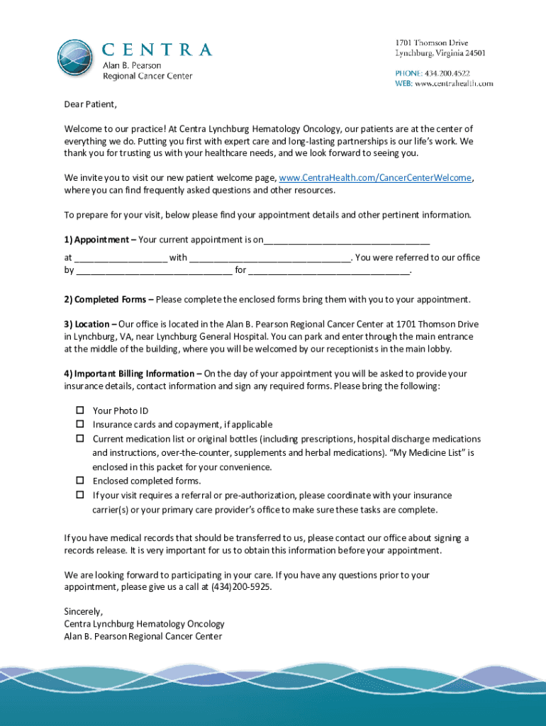 Dear Patient, Welcome to our practice! At Central Lynchburg Hematology Oncology, our patients are at the center of everything we do. Putting you first with expert care and long-lasting partnerships
