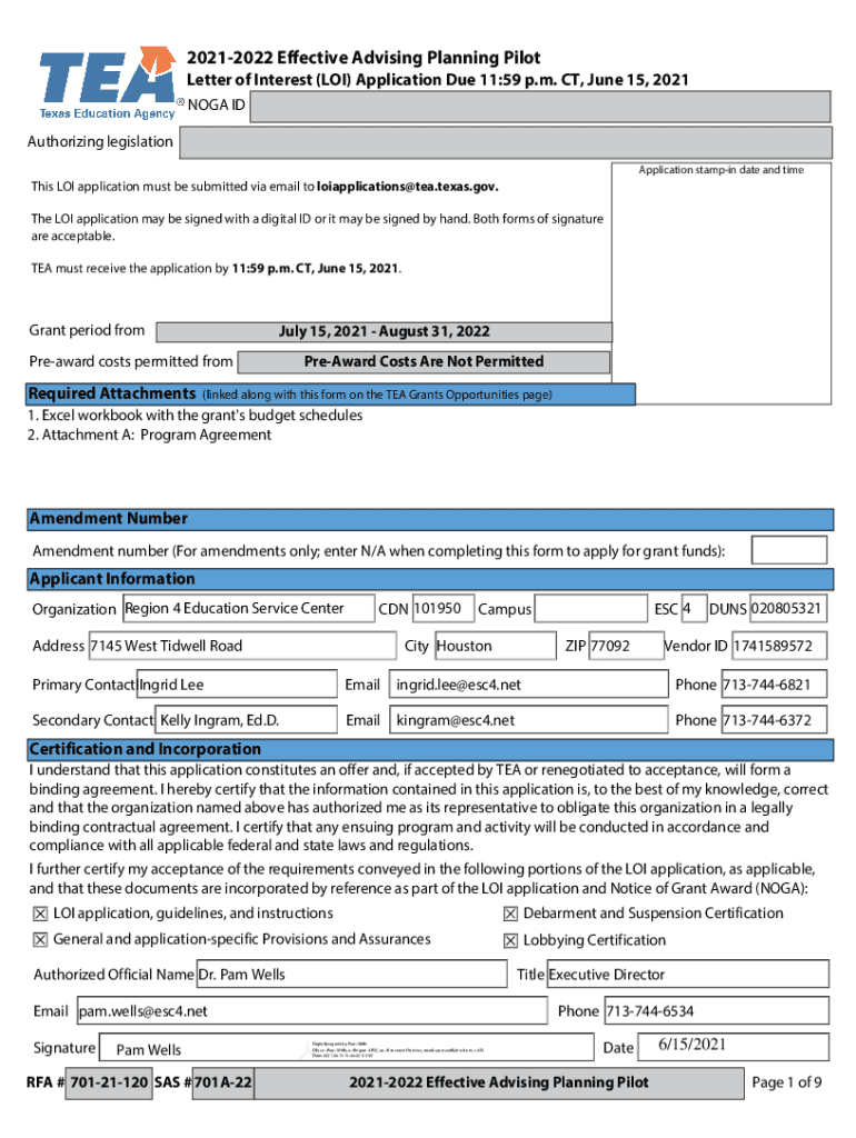 20212022 Effective Advising Planning PilotLetter of Interest (LOI) Application Due 11:59 p.m. CT, June 15, 2021, NOVA Authorizing legislation Application stamping date and times LOI application must