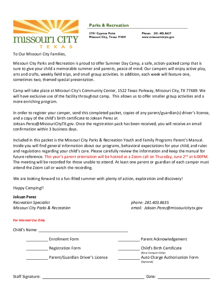 Parks & Recreation 2701 Cypress Point Missouri City, Texas 77459Phone: 281.403.8637 www.missouricitytx.govTo Our Missouri City Families, Missouri City Parks and Recreation is proud to offer Summer