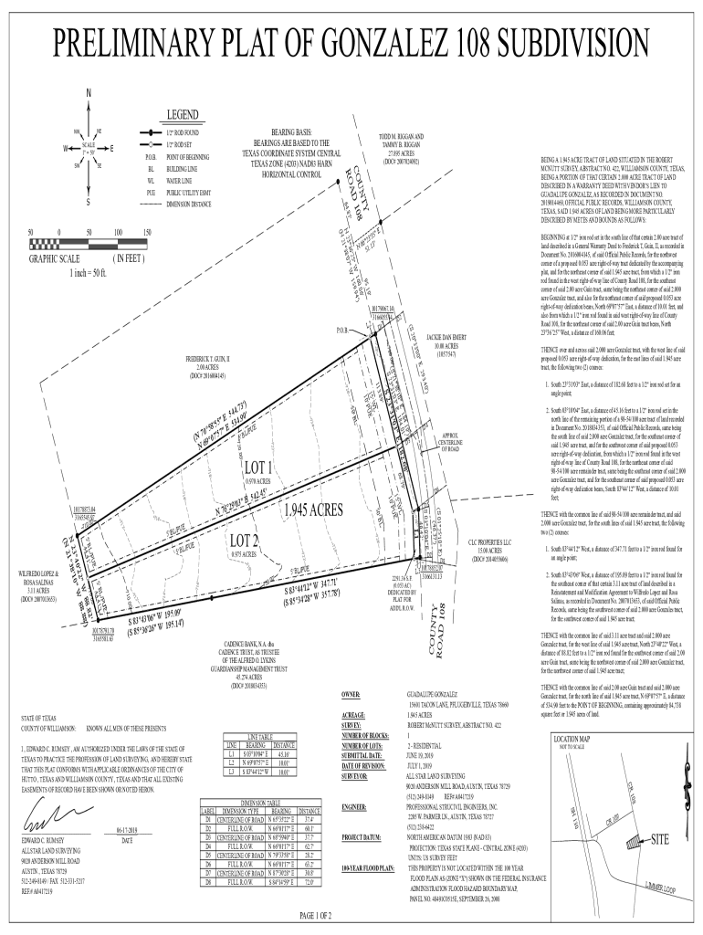 PRELIMINARY PLAT OF GONZALEZ 108 SUBDIVISION LEGEND NESCAFE 1\” 50\'W1×2\” ROD SET P.O.B.POINT OF BEGINNINGBLBUILDING LINEWLWATER LINEPUEPUBLIC UTILITY ESMTSDIMENSION DISTANCE50100GRAPHIC SCALE