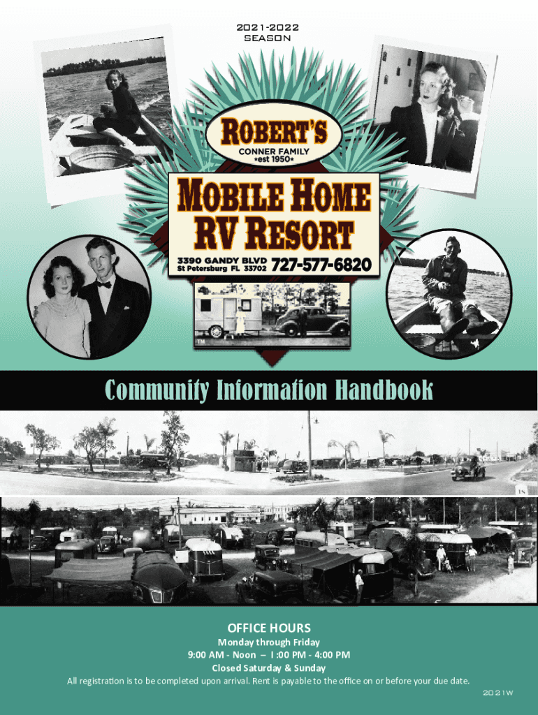 20212022 SEASONCommunity Information HandbookOFFICE HOURS Monday through Friday 9:00 AM Noon I :00 PM 4:00 PM Closed Saturday & Sunday All registration is to be completed upon arrival. Rent is payable