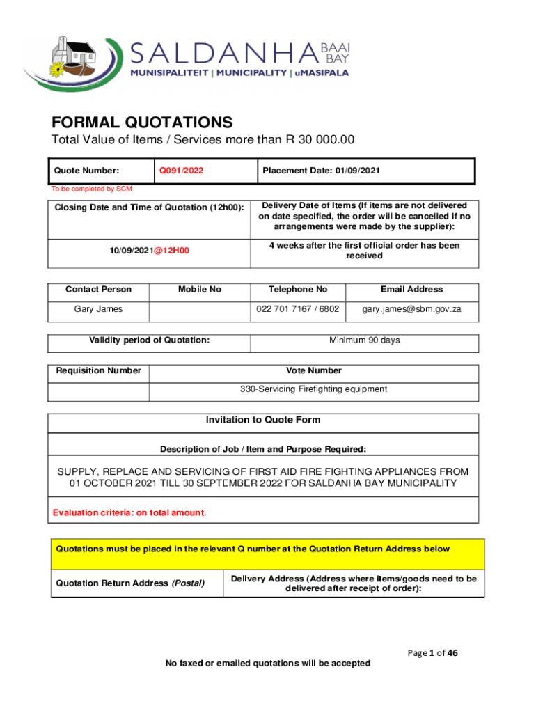 FORMAL QUOTATIONS Total Value of Items / Services more than R 30 000.00 Quote Number:Q091/2022Placement Date: 01/09/2021To be completed by Closing Date and Time of Quotation (12h00):4 weeks after