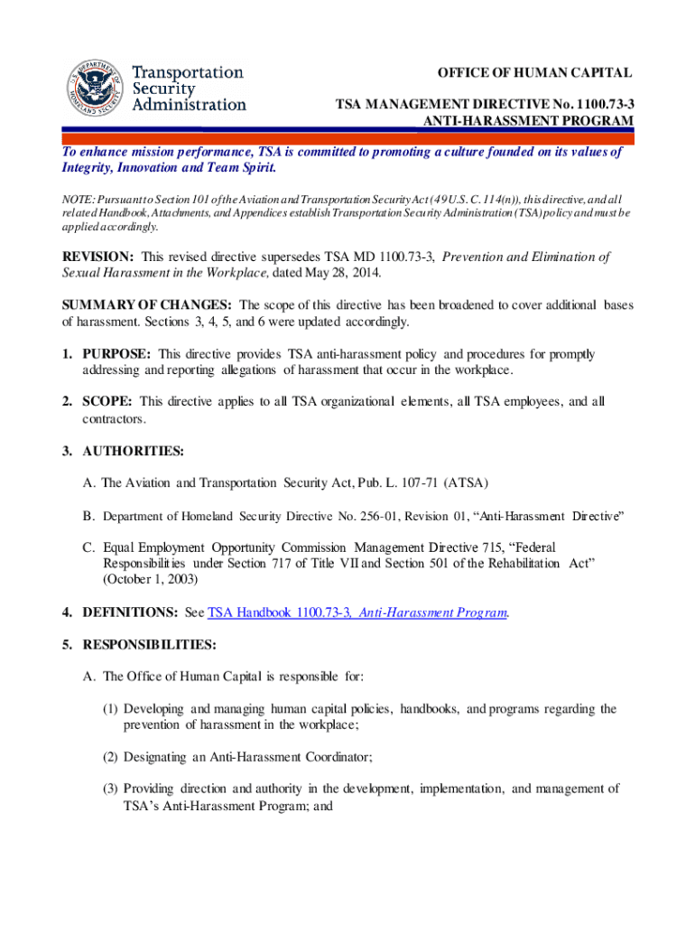 Get the free www.tsa.govsitesdefaultOFFICE OF HUMAN CAPITAL TSA MANAGEMENT DIRECTIVE No. 1100.73 ...