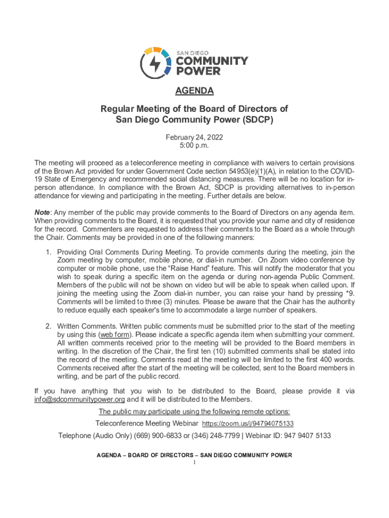 AGENDA Regular Meeting of the Board of Directors of San Diego Community Power (SDC) February 24, 2022 5:00 p.m. The meeting will proceed as a teleconference meeting in compliance with waivers to certain