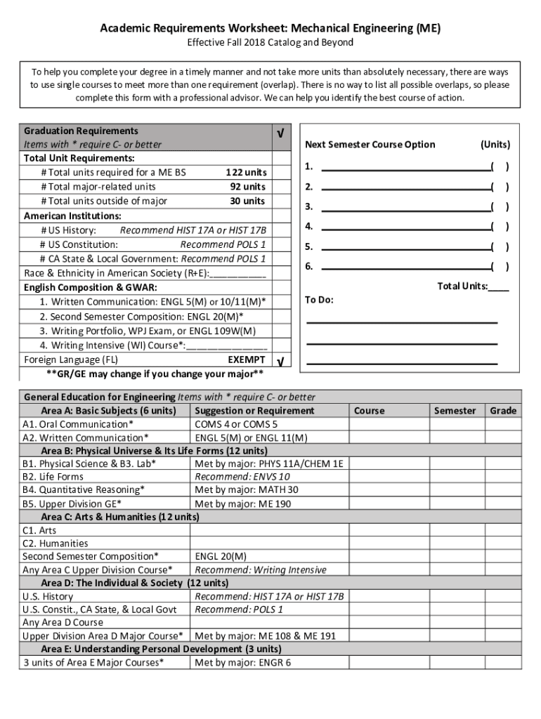 Academic Requirements Worksheet: Mechanical Engineering (ME) Effective Fall 2018 Catalog and Beyond help you complete your degree in a timely manner and not take more units than absolutely necessary,