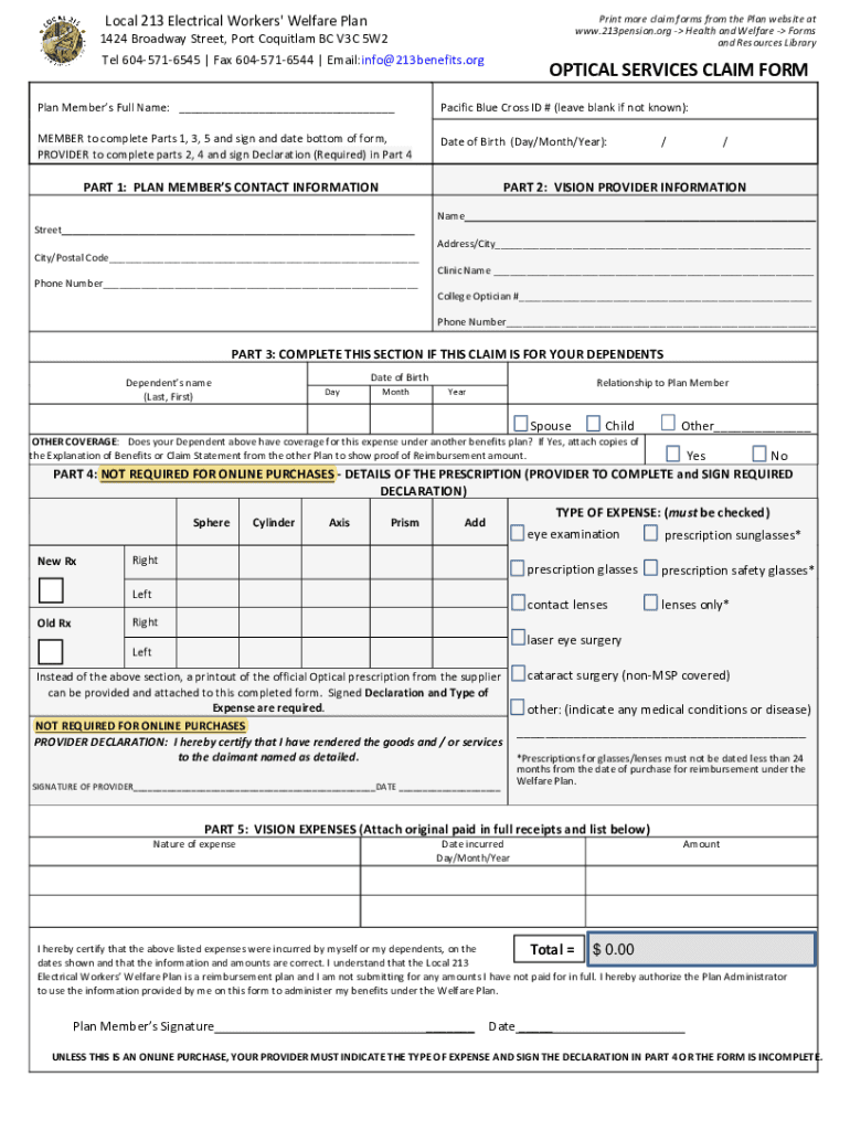 Local 213 Electrical Workers\' Welfare Planning more claim forms from the Plan website at www.213pension.org Health and Welfare Forms and Resources Library1424 Broadway Street, Port Coquitlam BC V3C