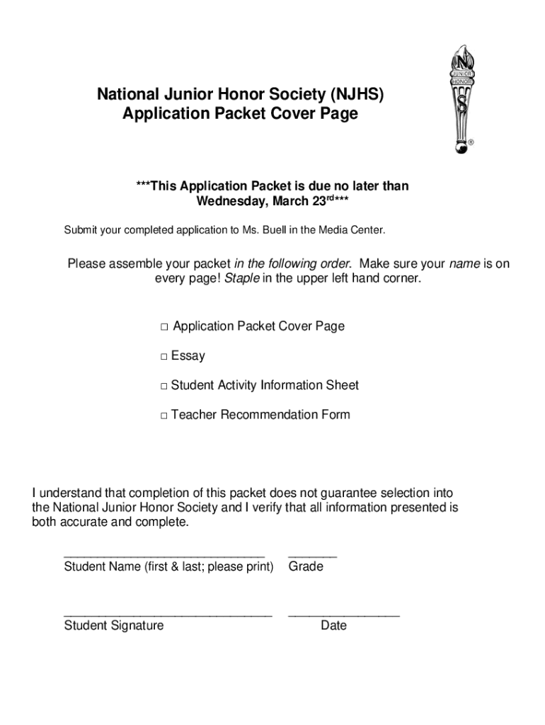 National Junior Honor Society (NHS) Application Packet Cover Page***This Application Packet is due no later than Wednesday, March 23rd*** Submit your completed application to Ms. Bell in the Media