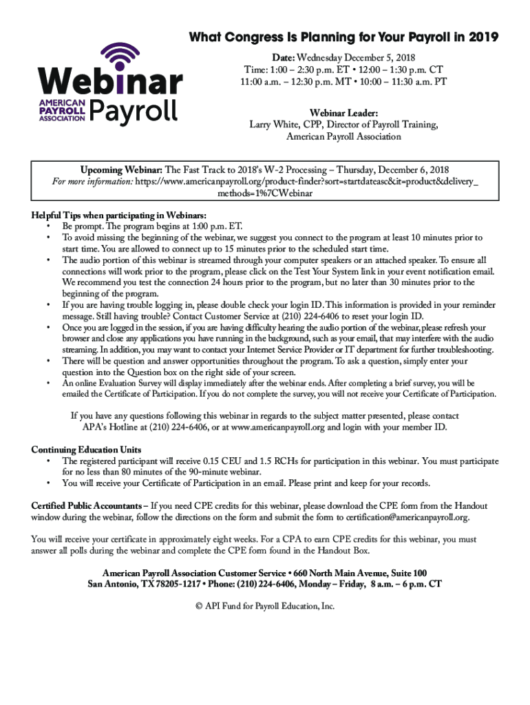 What Congress Is Planning for Your Payroll in 2019 Date: Wednesday, December 5, 2018, Time: 1:00 2:30 p.m. ET 12:00 1:30 p.m. CT 11:00 a.m. 12:30 p.m. MT 10:00 11:30 a.m. PT Webinar Leader: Larry