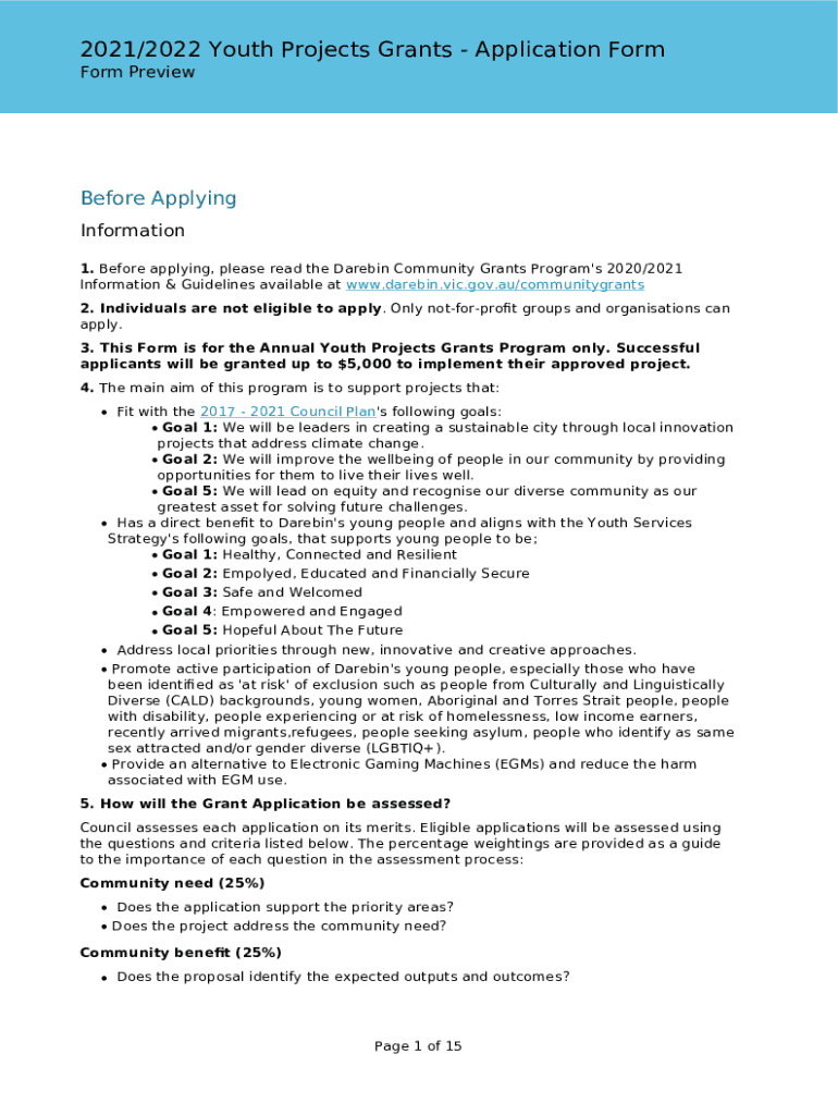 2021/2022 Youth Projects Grants Application Form PreviewBefore Applying Information 1. Before applying, please read the Darwin Community Grants Program\'s 2020/2021 Information & Guidelines available