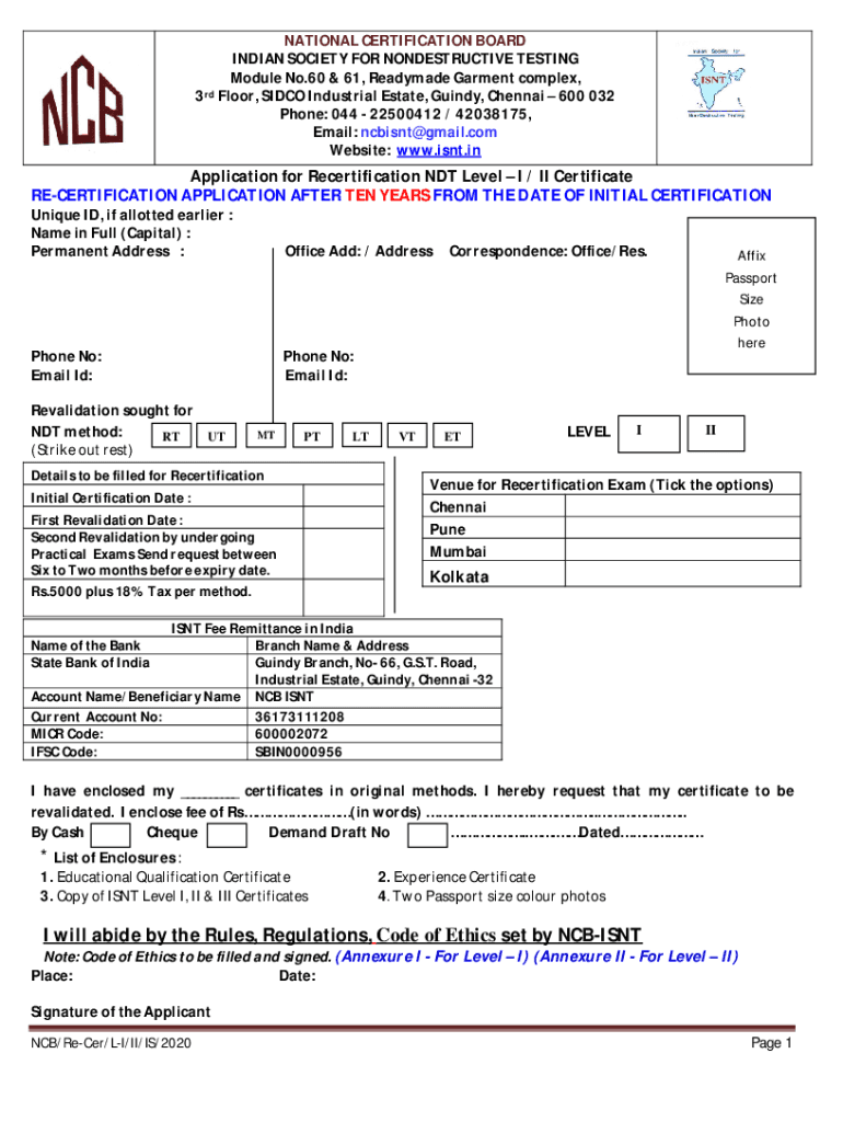 NATIONAL CERTIFICATION BOARD INDIAN SOCIETY FOR NONDESTRUCTIVE TESTING Module No.60 & 61, Ready made Garment complex, 3rd Floor, SI DCO Industrial Estate, Guide, Chennai 600 032 Phones: 044 22500412