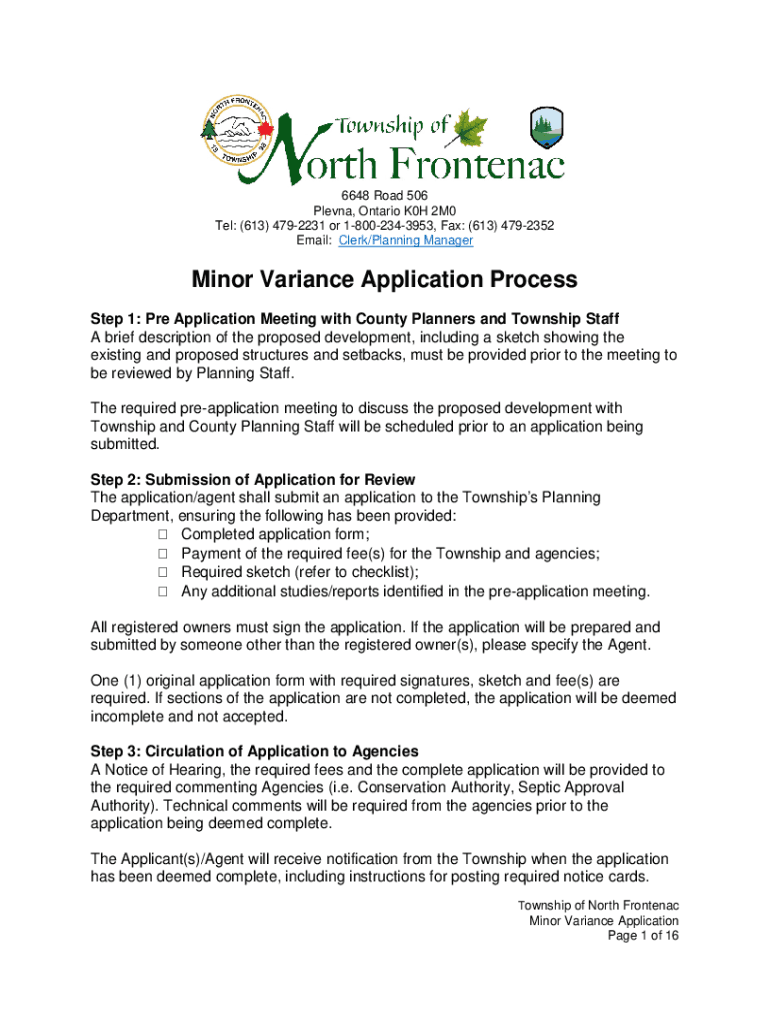 6648 Road 506 Elena, Ontario K0H 2M0 Tel: (613) 4792231 or 18002343953, Fax: (613) 4792352 Email: Clerk/Planning ManagerMinor Variance Application Process Step 1: PRE Application Meeting with County