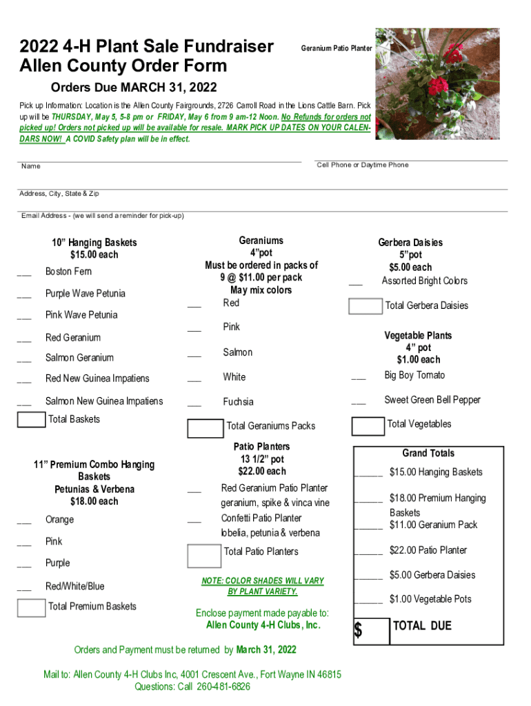 2022 4H Plant Sale Fundraiser Allen County Order FormGeranium Patio PlanterOrders Due MARCH 31, 2022, Pick up Information: Location is the Allen County Fairgrounds, 2726 Carroll Road in the Lions