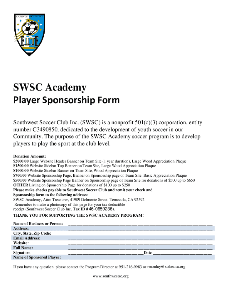 WSC Academy Player Sponsorship Form Southwest Soccer Club Inc. (WSC) is a nonprofit 501(c)(3) corporation, entity number C3490850, dedicated to the development of youth soccer in our Community. The