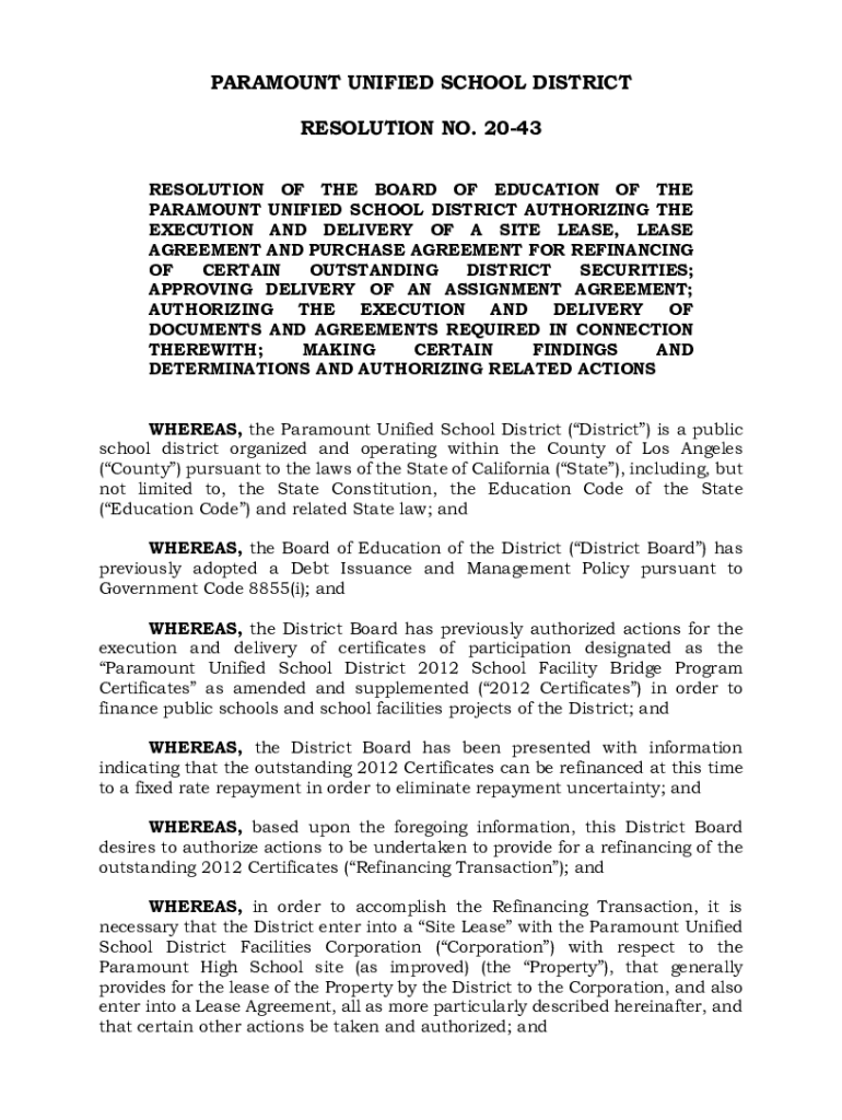 PARAMOUNT UNIFIED SCHOOL DISTRICT RESOLUTION NO. 2043 RESOLUTION OF THE BOARD OF EDUCATION OF THE PARAMOUNT UNIFIED SCHOOL DISTRICT AUTHORIZING THE EXECUTION AND DELIVERY OF A SITE LEASE, LEASE AGREEMENT