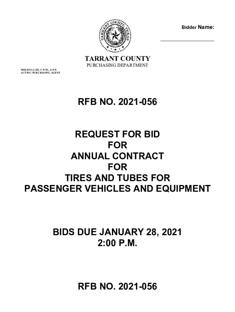 Bidder Name: ___TARRANT COUNTY MELISSA LEE, C.P.M., A.P.P. ACTING PURCHASING AGENTPURCHASING DEPARTMENT NO. 2021056 REQUEST FOR BID FOR ANNUAL CONTRACT FOR TIRES AND TUBES FOR PASSENGER VEHICLES AND