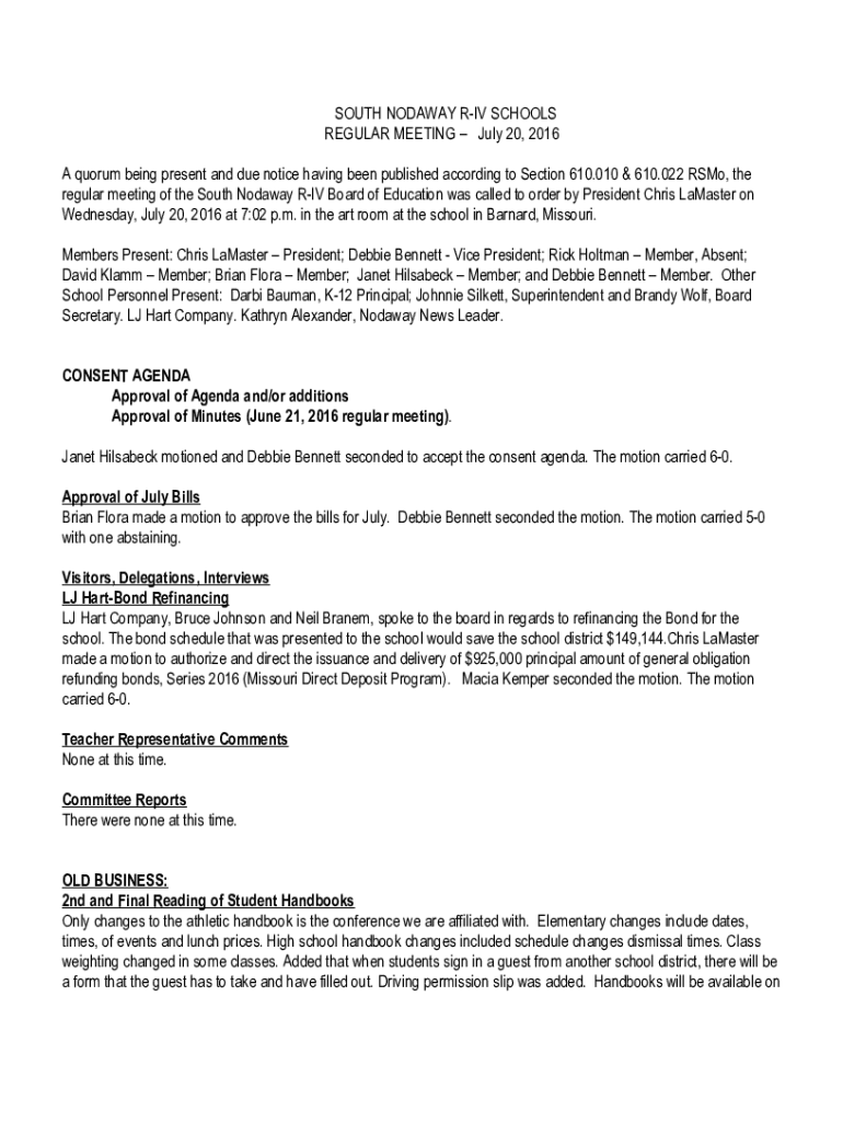SOUTHNODAWAYRIVSCHOOLS REGULARMEETINGJuly20,2016 AquorumbeingpresentandduenoticehavingbeenpublishedaccordingtoSection610.010&610.022RSMo,the regularmeetingoftheSouthNodawayRIVBoardofEducationwascalledtoorderbyPresidentChrisLaMasteron