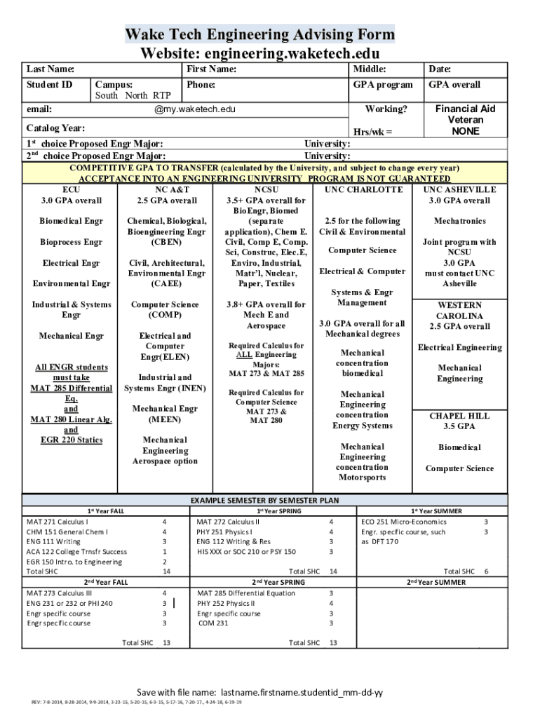 Wake Tech Engineering Advising Form Website: engineering. Wake tech.EULAs Name: Student ID email:First Name:Campus: Phone: South North RTP my. Wake tech.middle:Date:GPA program GPA overworking? Catalog