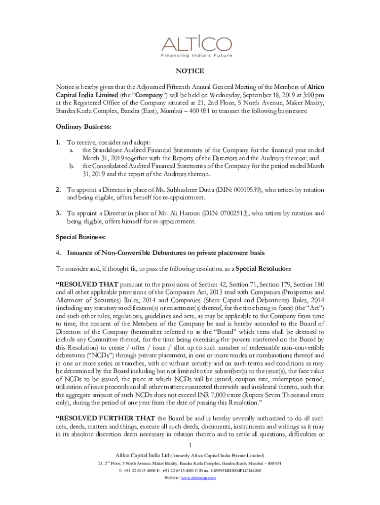 NOTICE is hereby given that the Adjourned Fifteenth Annual General Meeting of the Members of Alice Capital India Limited (the Company) will be held on Wednesday, September 18, 2019, at 3:00 pm at
