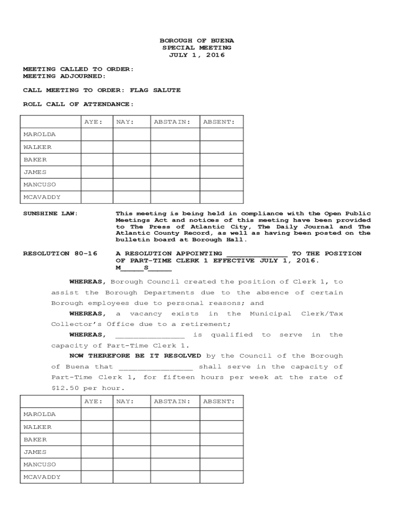 BOROUGH OF BUENA SPECIAL MEETING JULY 1, 2016, MEETING CALLED TO ORDER: MEETING ADJOURNED: CALL MEETING TO ORDER: FLAG SALUTE ROLL CALL OF ATTENDANCE: AYE:NAY:ABSTAIN:ABSENT:HAROLD WALKER BAKER JAMES
