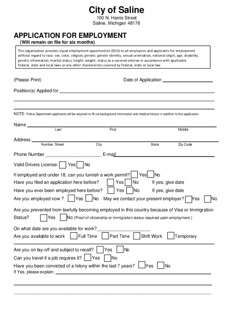 City of Saline 100 N. Harris Street Saline, Michigan 48176APPLICATION FOR EMPLOYMENT (Will remain on file for six months) This organization provides equal employment opportunities (EEO) to all employees
