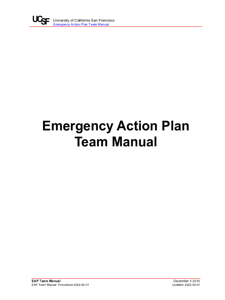 UCSFUniversity of California San Francisco Emergency Action Plan Team ManualEmergency Action Plan Team Manual EAP Team Manual Procedures 20220201December 3 2010Updated: 20220201UCSFUniversity of California