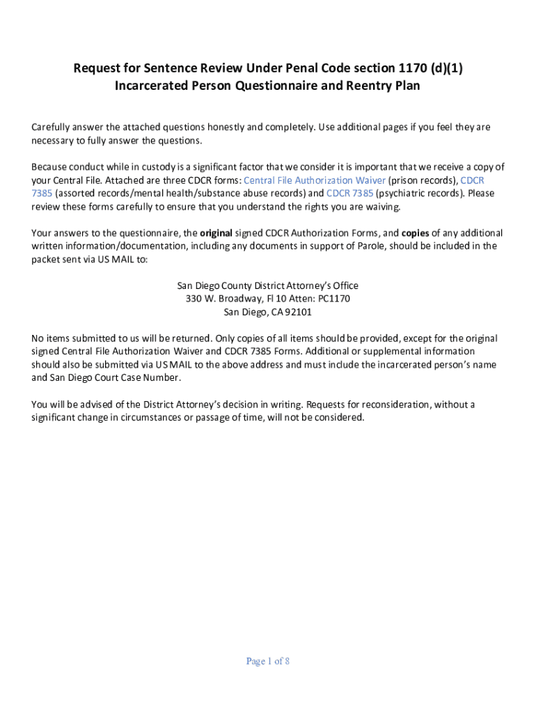 Request for Sentence Review Under Penal Code section 1170 (d)(1) Incarcerated Person Questionnaire and Reentry Plan Carefully answer the attached questions honestly and completely. Use additional