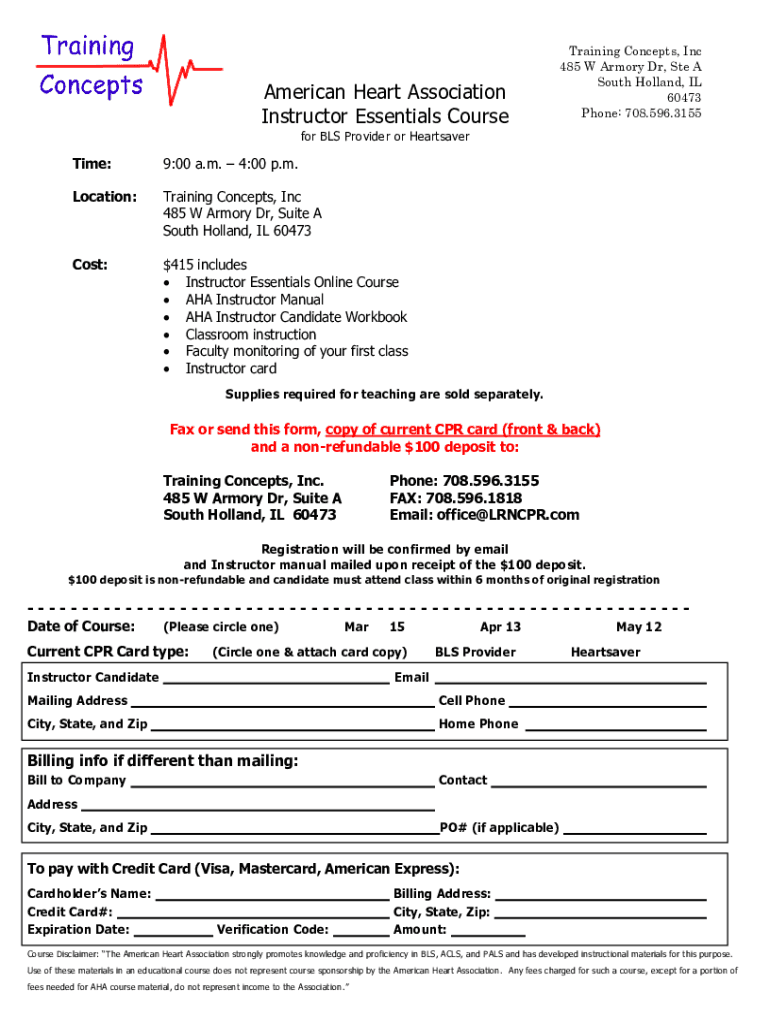 American Heart Association Instructor Essentials Course for BLS Provider or HeartsaverTime:9:00 a.m. 4:00 p.m. Location:Training Concepts, Inc 485 W Armory Dr, Suite A South Holland, IL 60473Cost:$415