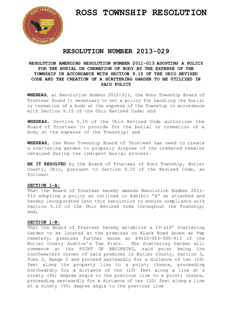 ROSS TOWNSHIP RESOLUTIONRESOLUTION NUMBER 2013029 RESOLUTION AMENDING RESOLUTION NUMBER 2011013 ADOPTING A POLICY FOR THE BURIAL OR CREMATION OF BODY AT THE EXPENSE OF THE TOWNSHIP IN ACCORDANCE WITH
