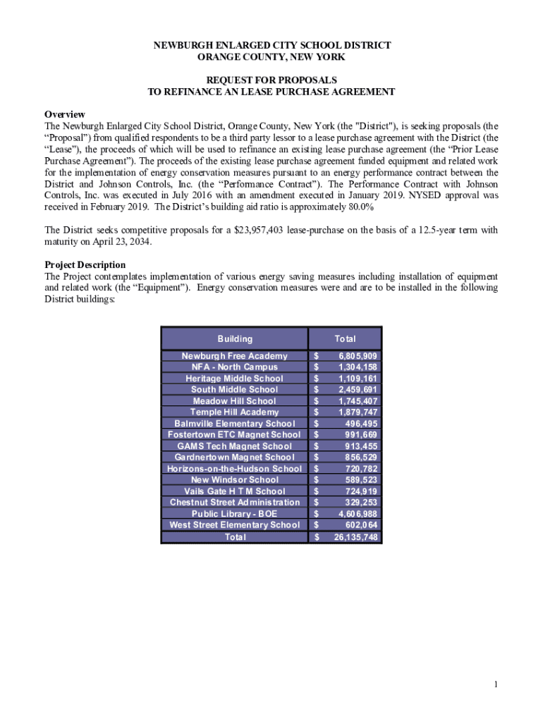 NEWBURGH ENLARGED CITY SCHOOL DISTRICT ORANGE COUNTY, NEW YORK REQUEST FOR PROPOSALS TO REFINANCE AN LEASE PURCHASE AGREEMENT Overview The Newburgh Enlarged City School District, Orange County, New