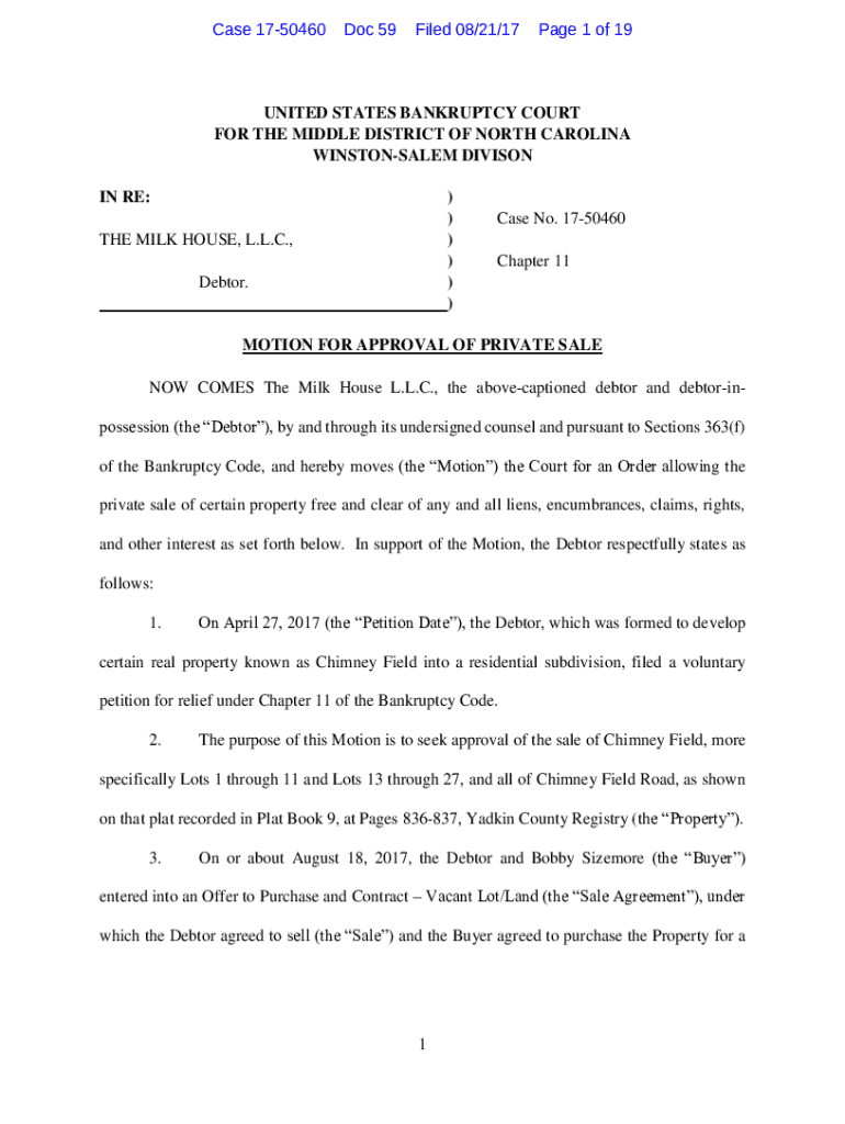 Case 1750460Doc 59Filed 08/21/17Page 1 of 19UNITED STATES BANKRUPTCY COURT FOR THE MIDDLE DISTRICT OF NORTH CAROLINA WINSTONSALEM DIVISION IN RE:))))))THE MILK HOUSE, L.L.C., Debtor. Case No. 1750460