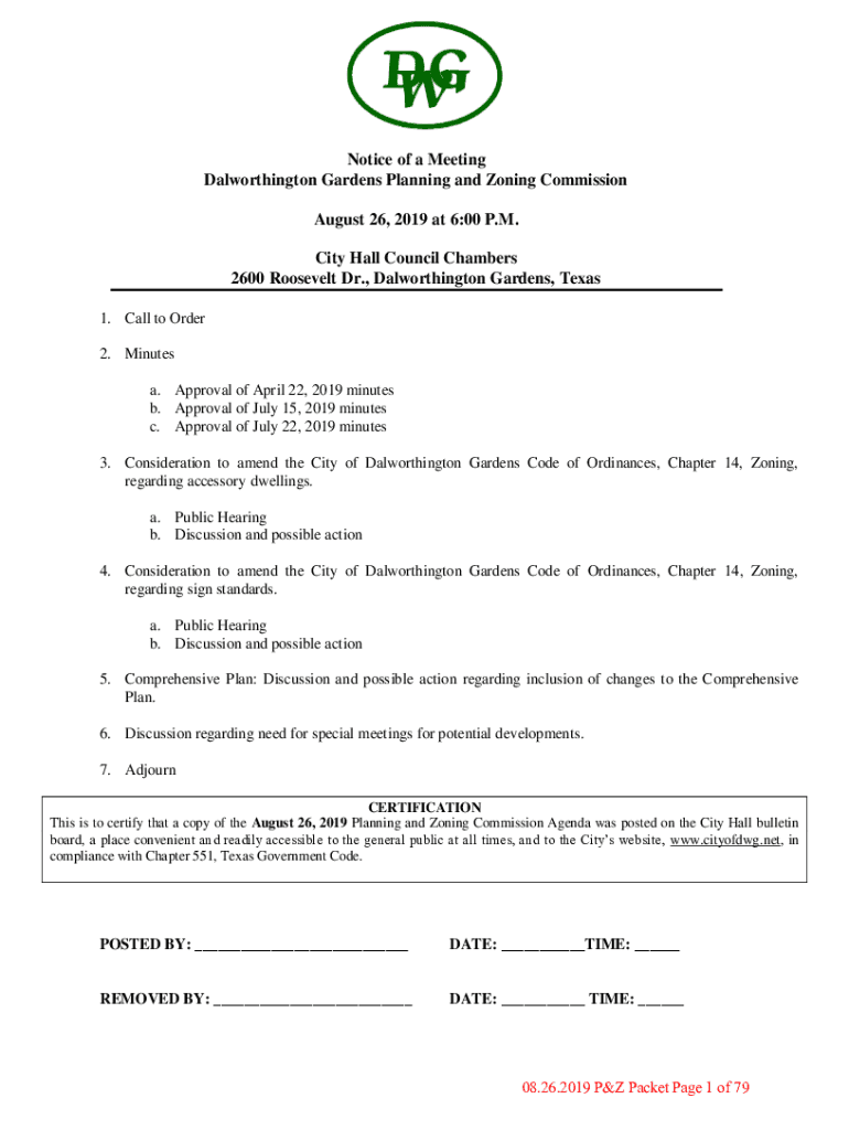 Notice of a Meeting Worthington Gardens Planning and Zoning Commission August 26, 2019, at 6:00 P.M. City Hall Council Chambers 2600 Roosevelt Dr., Worthington Gardens, Texas 1. Call to Order 2. Minutes