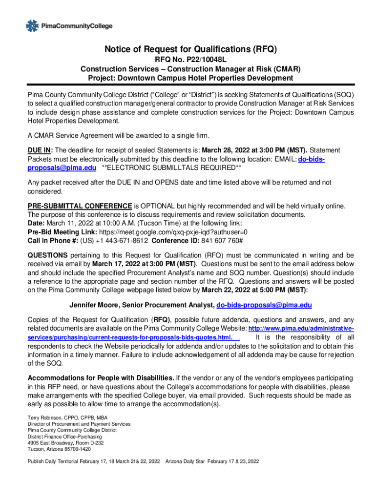 Notice of Request for Qualifications (RFQ) RFQ No. P22/10048L Construction Services Construction Manager at Risk (CAR) Project: Downtown Campus Hotel Properties Development Pima County Community College