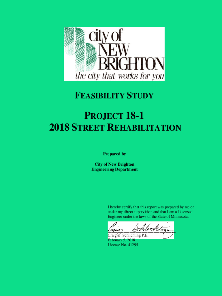 FEASIBILITY SUBPROJECT 181 2018 STREET REHABILITATION Prepared by City of New Brighton Engineering Department hereby certify that this report was prepared by me or under my direct supervision and