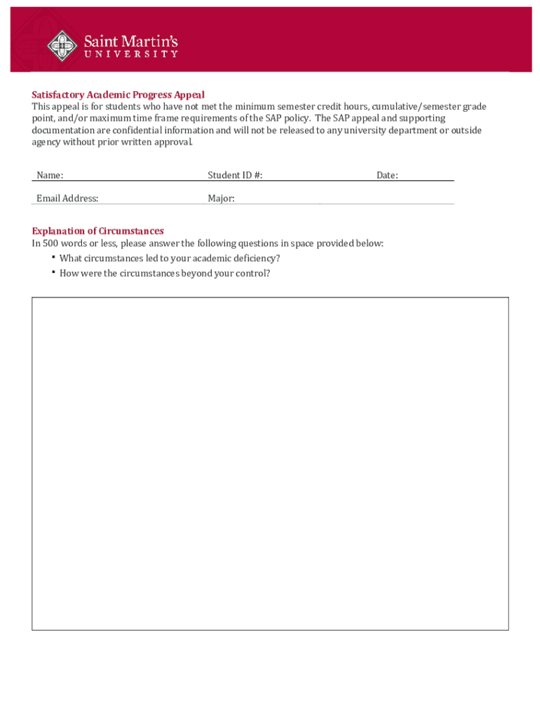 Satisfactory Academic Progress Appeals appeal is for students who have not met the minimum semester credit hours, cumulative/semester grade point, and/or maximum time frame requirements of the SAP