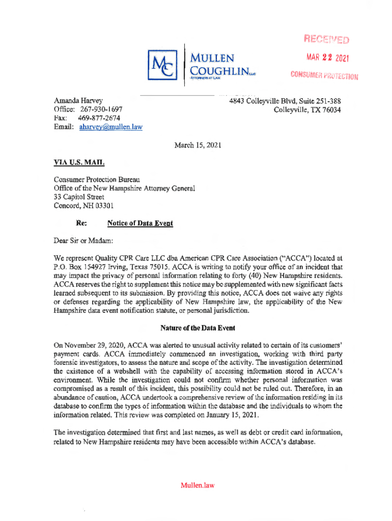 MULLER 2 2 2021CQUGHLINLLc ATTORNEYS AT LAW Amanda Harvey Office: 2679301697 Fax: 4698772674 Email: Harvey×Mullen.law4843 Coffeyville Blvd, Suite 251388 Coffeyville, TX 76034March 15, 2021 VIA U.S.