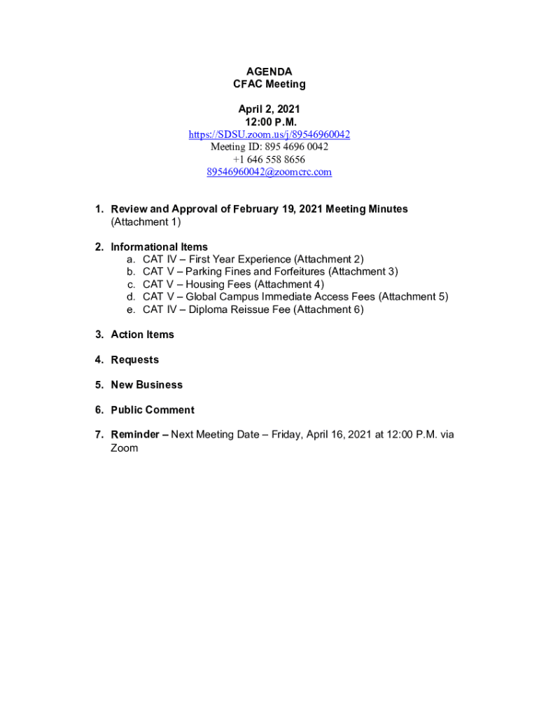 AGENDA CAC Meeting April 2, 2021 12:00 P.M. https://SDSU.zoom.us/j/89546960042 Meeting ID: 895 4696 0042 +1 646 558 8656 89546960042×zoomcrc.com 1. Review and Approval of February 19, 2021, Meeting