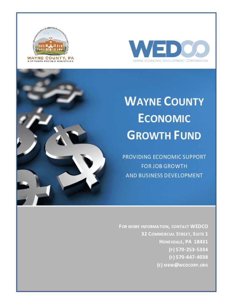 WAYNE COUNTY ECONOMIC GROWTH FUND PROVIDING ECONOMIC SUPPORT FOR JOB GROWTH AND BUSINESS DEVELOPMENT FOR MORE INFORMATION, CONTACT WE DCO 32 C COMMERCIAL S STREET, SU ITE 1 H TEESDALE, PA 18431 (P)
