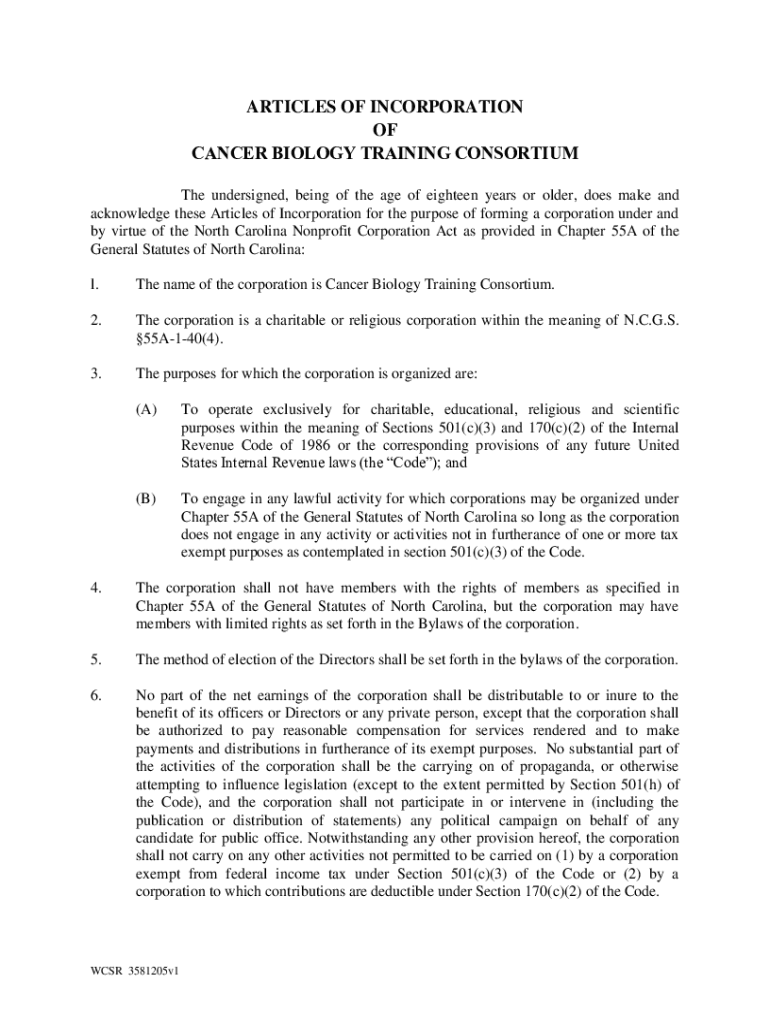 ARTICLES OF INCORPORATION OF CANCER BIOLOGY TRAINING CONSORTIUM The undersigned, being of the age of eighteen years or older, does make and acknowledge these Articles of Incorporation for the purpose